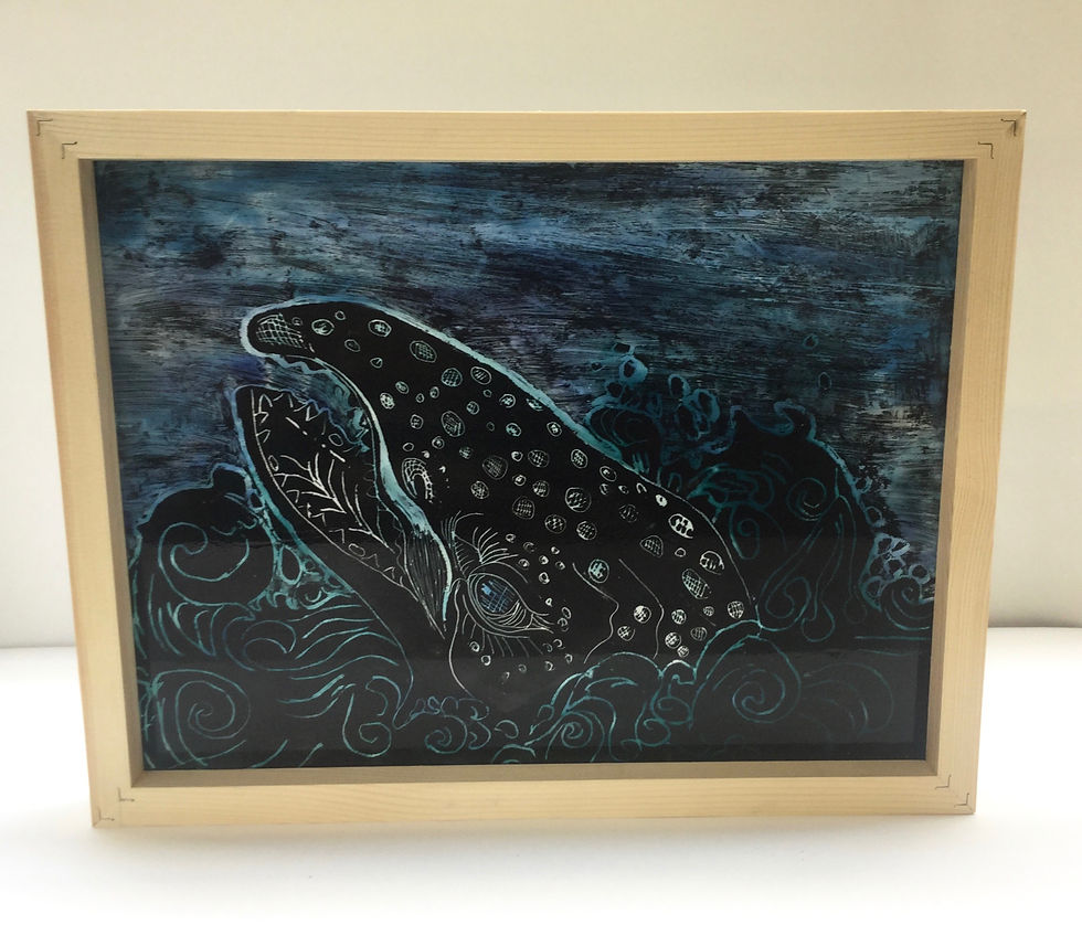 The pictures have been framed into box that is free standing. This framed piece is to be placed on a windowsill to enable the sunlight to shine through it, thus enhancing the colour work.