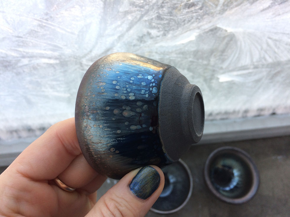 Allen Richards, one of the pupils are using this beautiful glaze. It look a bit like the one you requested from me. I brought the three tea-cup from him, these are the best photos i can get of the colour change during firing on the three samples. Is this the glaze you wanted?